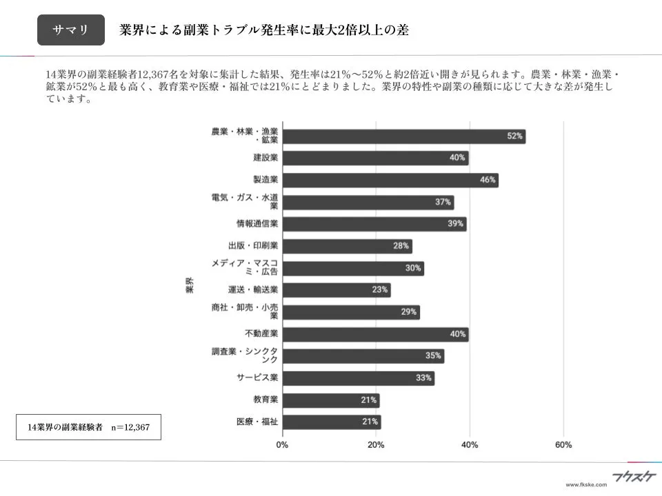 14業界の副業経験者12,367名を対象に集計した結果、発生率は21%~52%と約2倍近い開きが見られます。農業・林業・漁業・鉱業が52%と最も高く、教育業や医療・福祉では21%にとどまりました。業界の特性や副業の種類に応じて大きな差が発生しています。