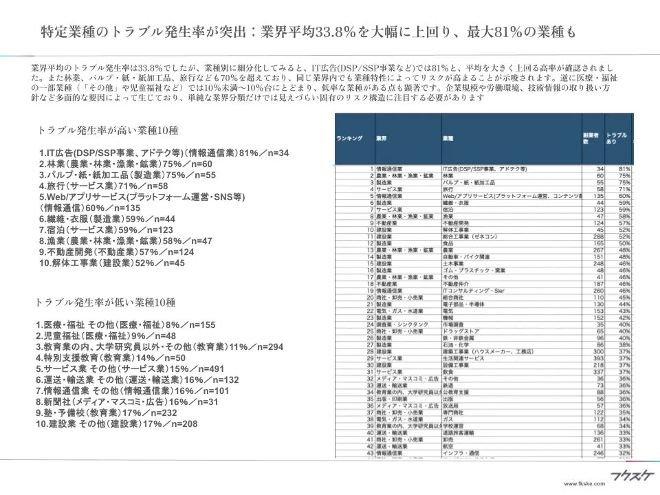 ■特定業種のトラブル発生率が突出:業界平均33.8%を大幅に上回り、最大81%の業種も