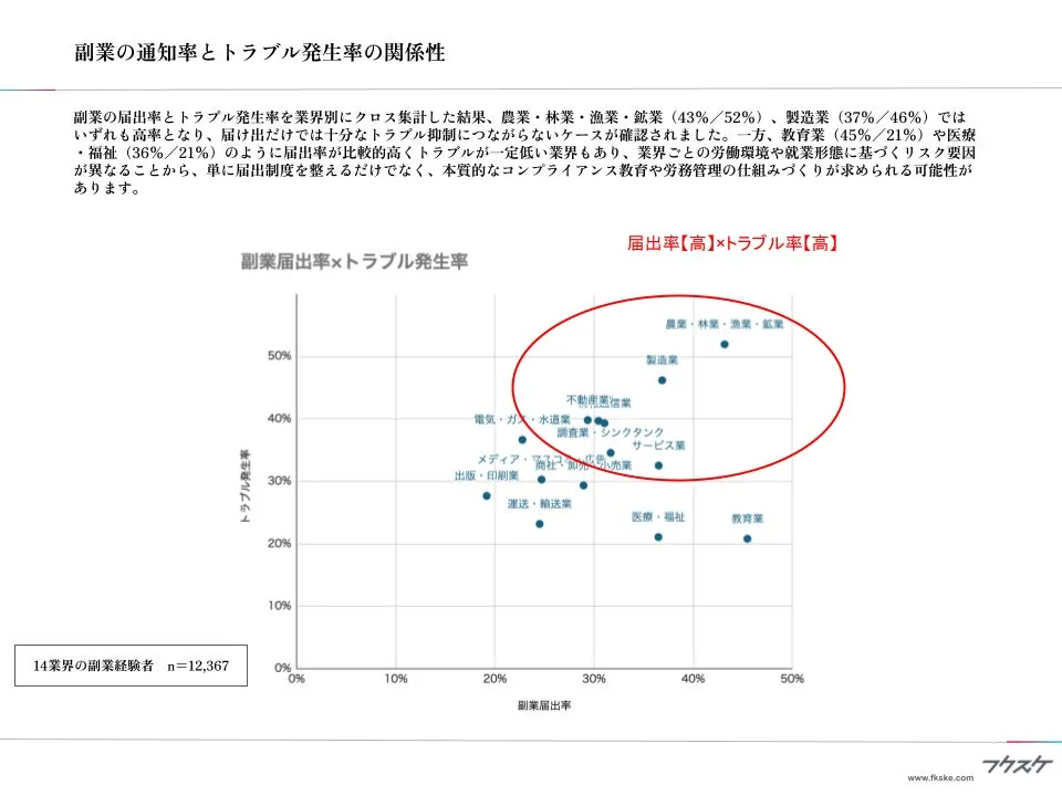 副業事故防止・監査プラットフォーム「フクスケ」を提供する株式会社フクスケ(本社:東京都千代田区、代表取締役:小林 大介、以下「フクスケ」)は、2月9日「副業の日」にあわせ、主要14業界・97業種を対象に実施した「副業・兼業トラブルに関する業界・業種別実態調査」の結果を公開しました。「副業・兼業トラブルに関する業界・業種別実態調査」https://fkske.com/posts/sidehustletrouble