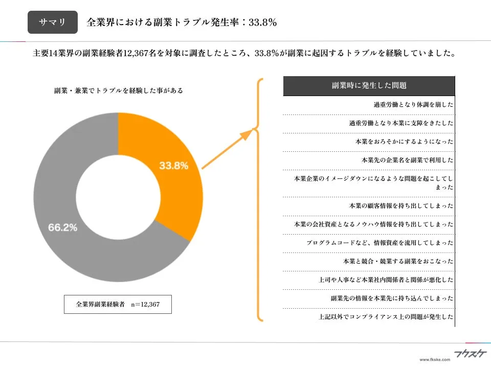 主要14業界の副業経験者12,367名を対象に調査したところ、33.8%が副業に起因するトラブルを経験していました。