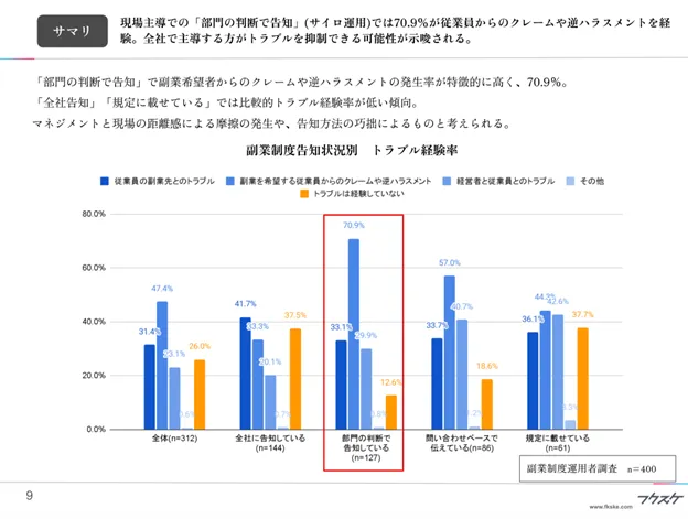 「部門の判断で告知」で副業希望者からのクレームや逆ハラスメントの発生率が特徴的に高く、70.9%。「全社告知」「規定に載せている」では比較的トラブル経験率が低い傾向。マネジメントと現場の距離感による摩擦の発生や、告知方法の巧拙によるものと考えられる。