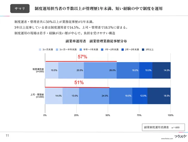 制度運者・管理者共に50%以上が業務従事歴が1年未満。3年以上従事している者は制度運用者で14.5%、上司・管理者で18.5%に留まる。制度運用の現場は若手・経験が浅い層が中心で、負担を受けやすい構造