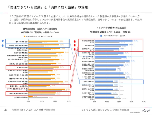 「自己評価で“管理できている”と答えた企業/人」は、社外案件紹介や説明会といった促進策を比較的多く実施している一方で、実際に事故抑止に寄与していたのは副業時間申告や規程改定といった基盤施策。管理できているという担当者の自己認識と、事故抑止に効く施策の間には乖離が見られた。