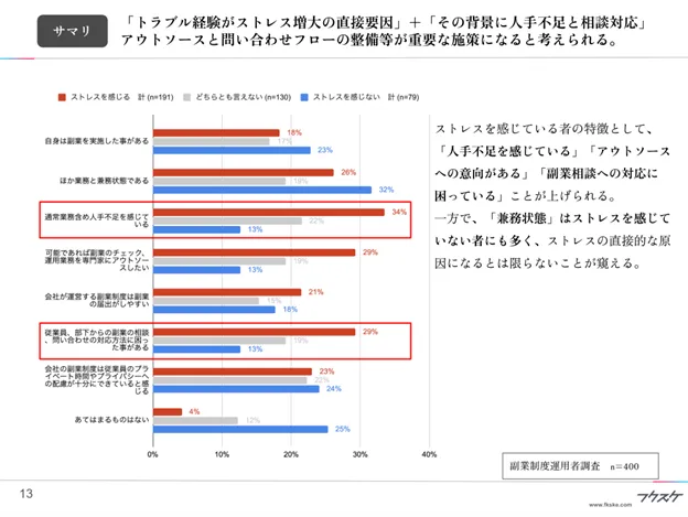 アウトソースと問い合わせフローの整備等が重要な施策になると考えられる。ストレスを感じている者の特徴として、「人手不足を感じている」「アウトソースへの意向がある」「副業相談への対応に困っている」ことが上げられる。一方で、「兼務状態」はストレスを感じていない者にも多く、ストレスの直接的な原因になるとは限らないことが窺える。