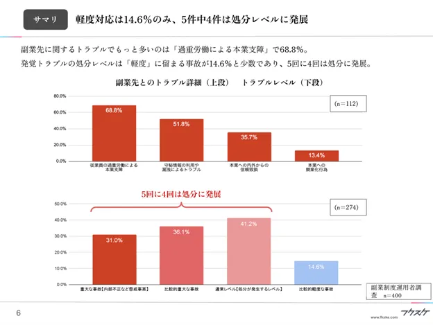 副業先に関するトラブルでもっと多いのは「過重労働による本業支障」で68.8%。発覚トラブルの処分レベルは「軽度」に留まる事故が14.6%と少数であり、5回に4回は処分に発展。