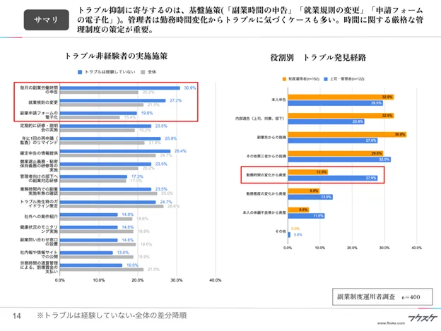■トラブル抑制に寄与するのは、基盤施策(「副業時間の申告」「就業規則の変更」「申請フォームの電子化」)。管理者は勤務時間変化からトラブルに気づくケースも多い。時間に関する厳格な管理制度の策定が重要。