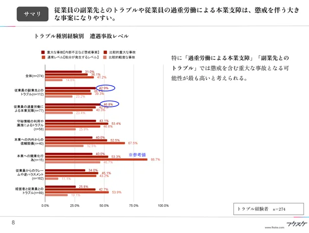 特に「過重労働による本業支障」「副業先とのトラブル」では懲戒を含む重大な事故となる可能性が最も高いと考えられる。
