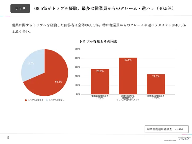 副業に関するトラブルを経験した回答者は全体の68.5%。特に従業員からのクレームや逆ハラスメントが40.5%と最も多い。