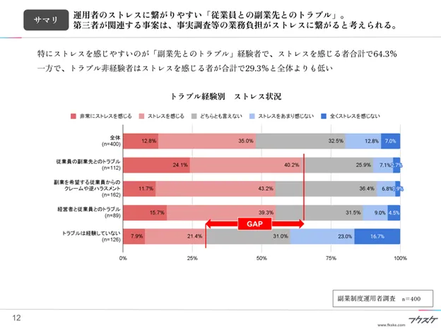 特にストレスを感じやすいのが「副業先とのトラブル」経験者で、ストレスを感じる者合計で64.3%。一方で、トラブル非経験者はストレスを感じる者が合計で29.3%と全体よりも低い