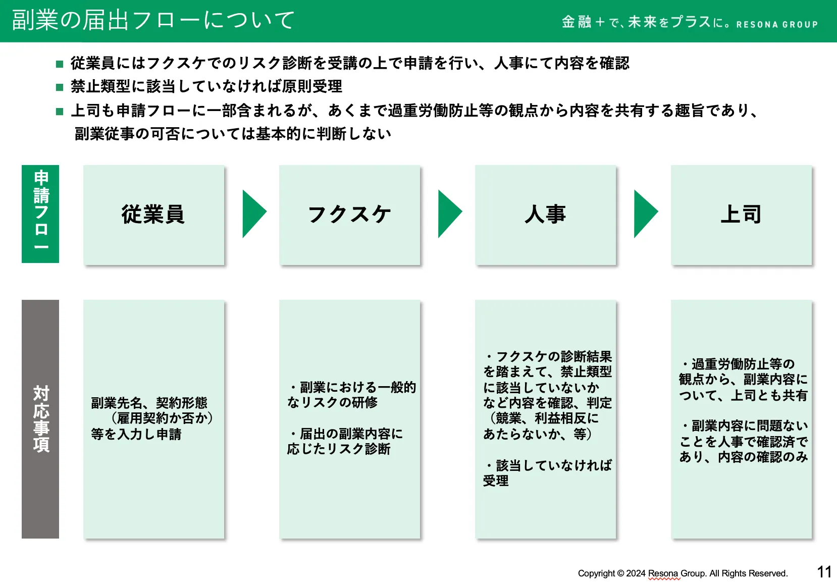 とはいえ、それを運用していくためには、各行で同じ基準を共有する仕組みが必要になりました。そこで、第三者による副業リスク診断サービスなどを活用しながら、具体的な申請・審査フローや研修を整えたんです。