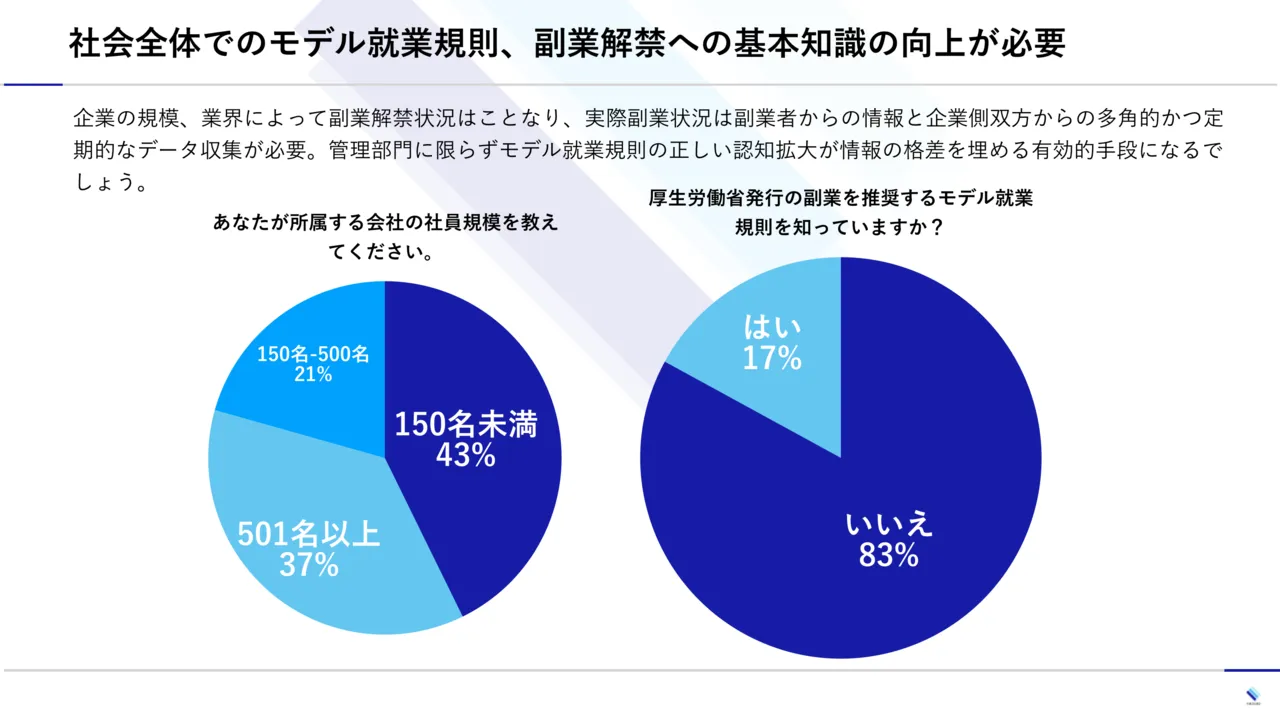 ●主な調査項目:会社規模。副業解禁状況、副業申請方法、副業(伏業)経験モデル就業規則に認知、副業リスクに関する需要
