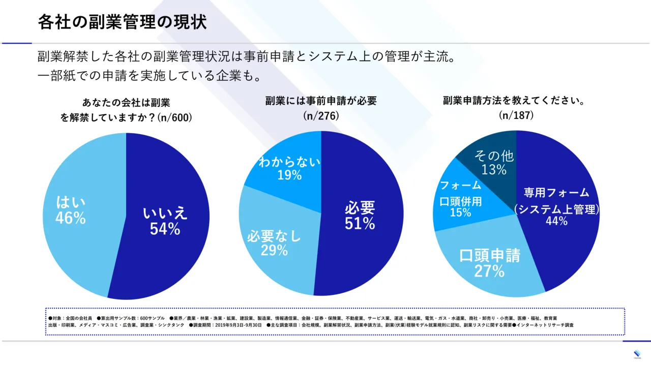 今回の調査で副業解禁している企業の半数で最低限の事前申請の管理が行われており、競業避止、労務チェックが一定行われているのがわかりました。