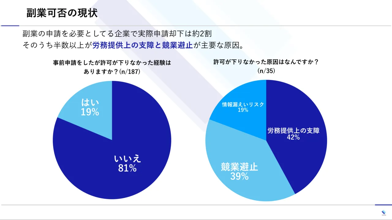 一方約2割が副業申請許可が下りない経験があり、理由としては労務提供上の支障、競業避止に抵触するのが主な原因でした。