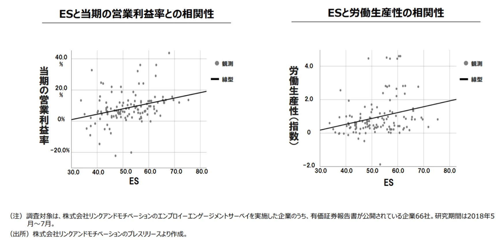 エンゲージメントの向上はイノベーション創出の前提となるものであり、営業利益率や労働生産性と正の相関関係がある可能性が指摘されています。
