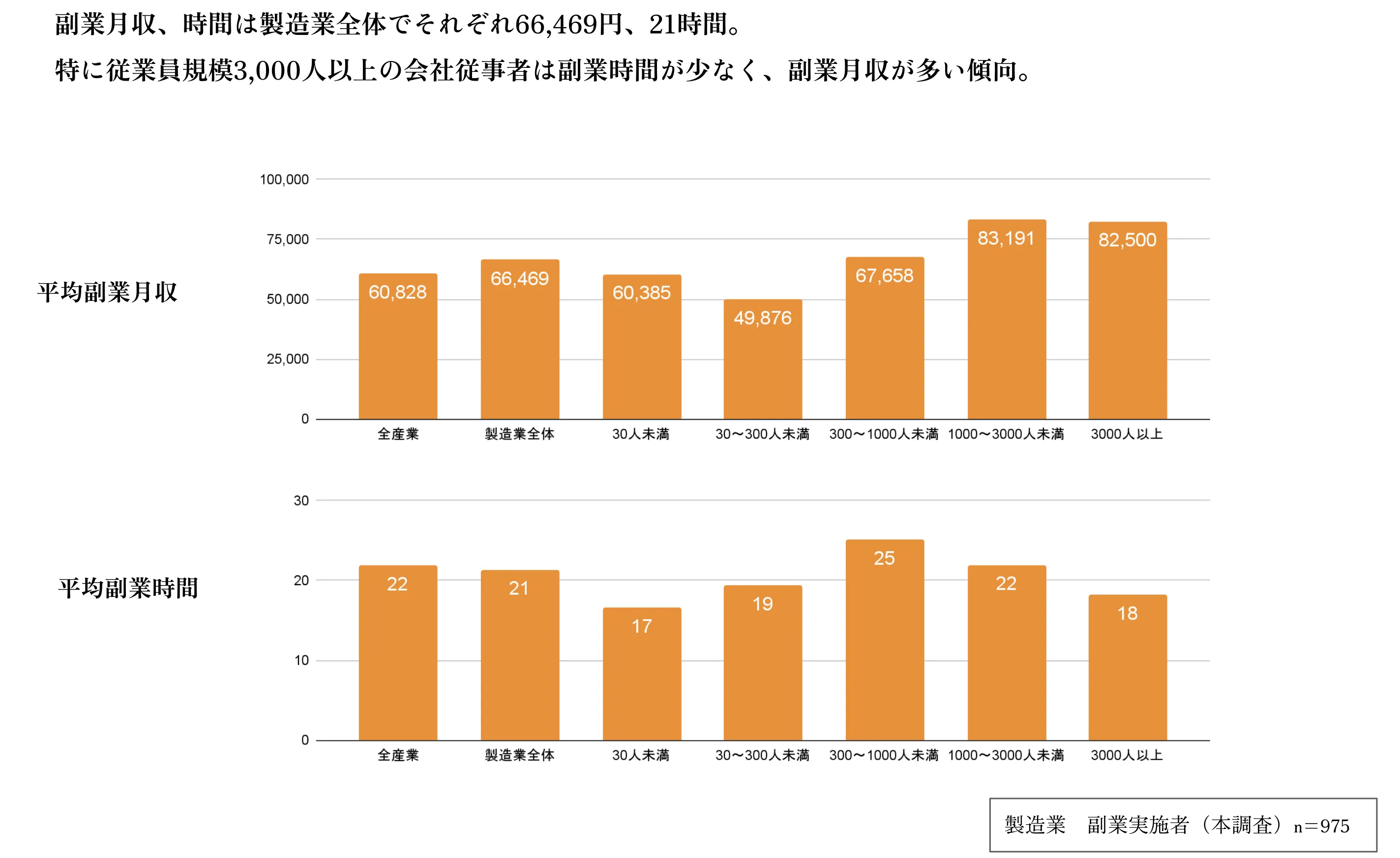 副業月収、時間は製造業全体でそれぞれ66,469円、21時間。