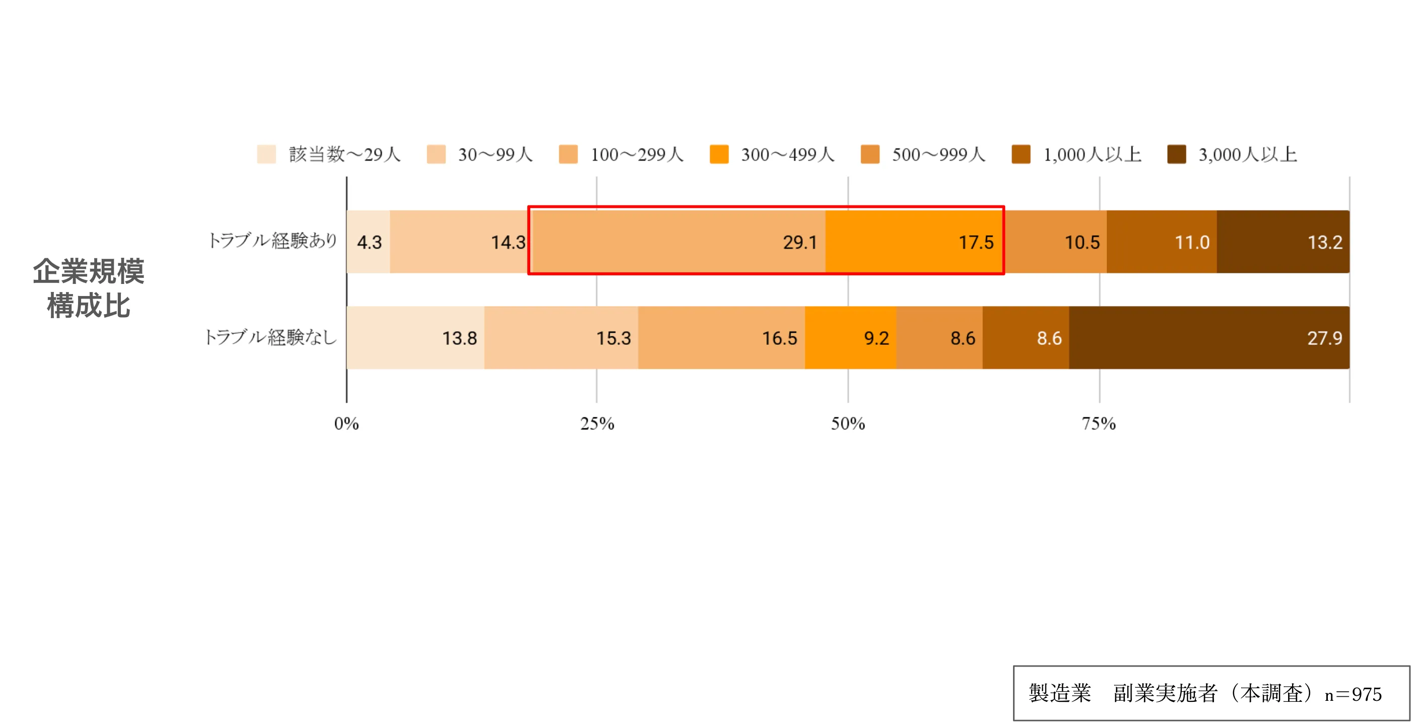 トラブル経験者においては従業員規模100~500人規模に務める企業の割合が多い。