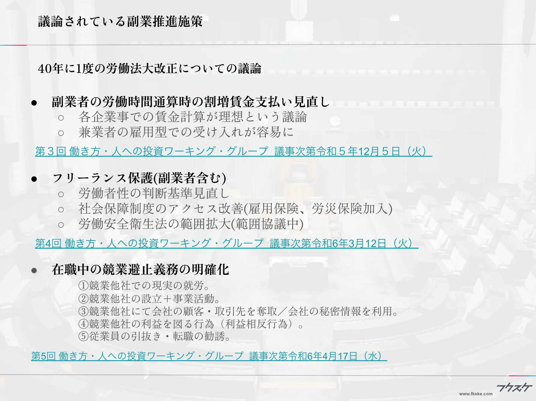 この会議内では現状の労働基準法内の通算規定が企業による副業者の正式雇用を難しくしている現状が指摘されています。