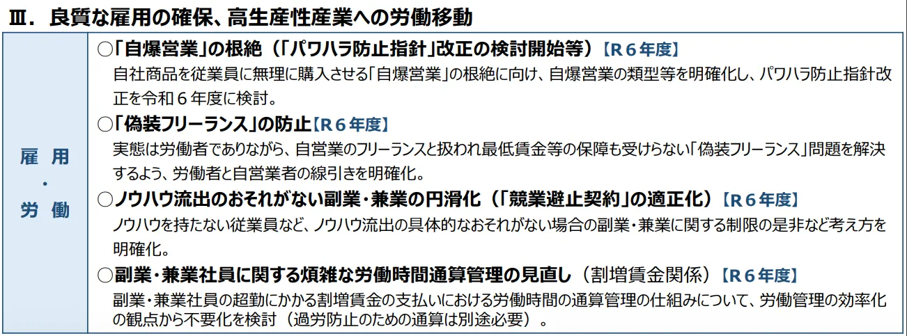 可能な限り早期に実現する項目として、法人による過度な競業避止義務の抑制、偽装フリーランスの防止があげられた。副業者を雇用する際の割増賃金の通算撤廃含め、政府によるさらなる解釈変更が準備されている。